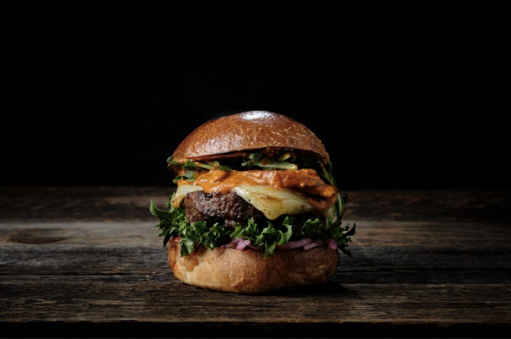 Riittävästi rapeaa pekonia, naudan smash-pihvi, aitoa majoneesia, pekonihilloketta, pihvitomaattia ja salaattia. Tarjoillaan rapeiden ranskalaisten kera. (M,G*)